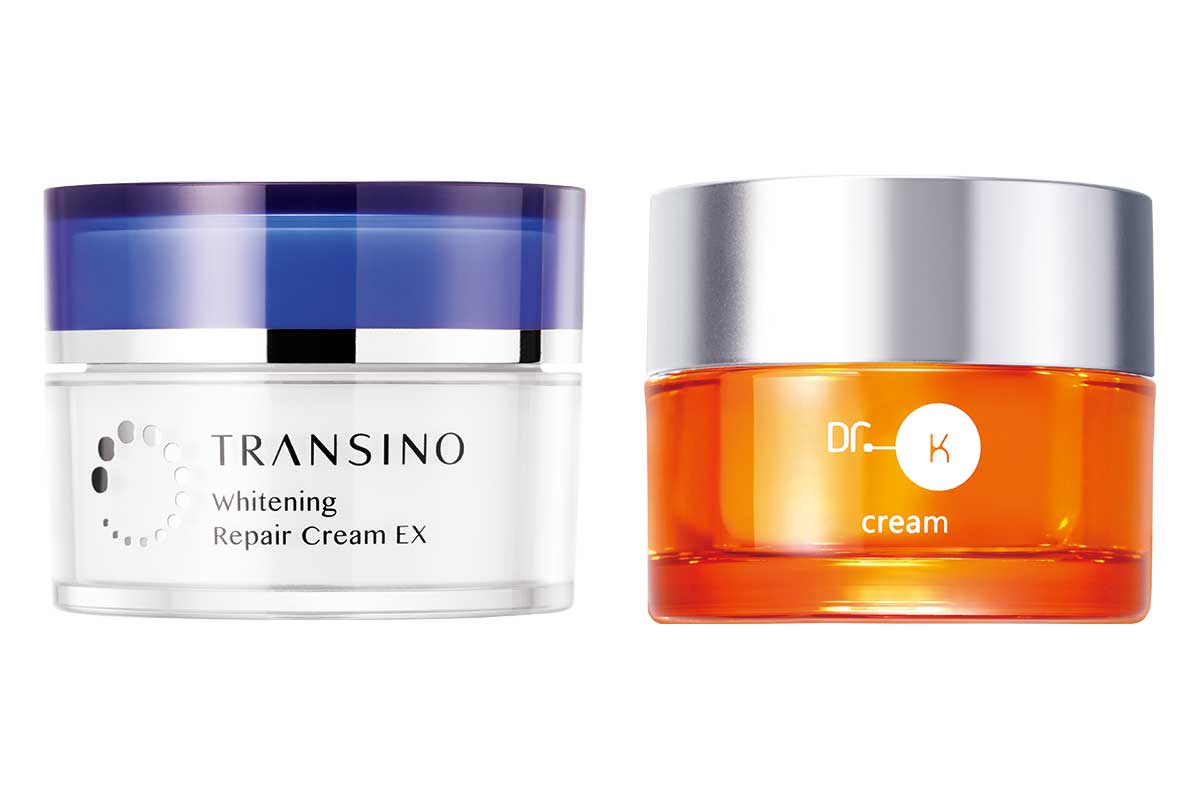 左から:トラネキサム酸を配合したジェルで透明感のある肌に。トランシーノ薬用ホワイトニングリペアクリームEX [医薬部外品] 35g ¥4,400〈編集部調べ〉(第一三共ヘルスケア)美白やシワ改善、抗炎症にレチノール誘導体など有効成分が炎症老化を徹底防御。ドクターケイ 薬用ABC-GプレミアムクリームTA [医薬部外品]30g ¥8,250(ドクターケイ)