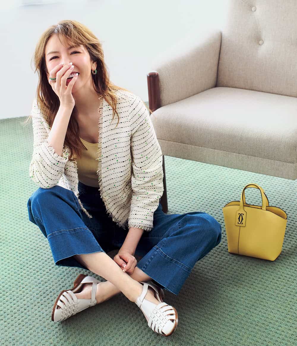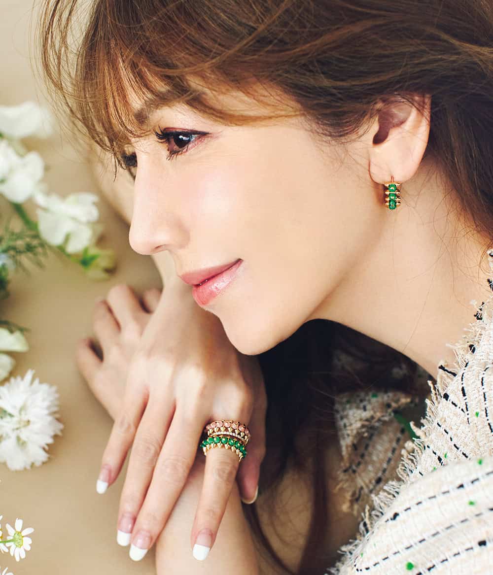 「クラッシュ ドゥ カルティエ」イヤリング〈PG×グリーンアゲート〉¥1,557,600リング〈PG×グリーンアゲート〉リング〈PG×ピンクカルセドニー〉各¥1,056,000「エタンセル ドゥ カルティエ」 ウェディング リング〈PG×DIA〉¥902,000バッグ「C ドゥ カルティエ」ミニトート〈H18×W25×D8〉¥429,000(すべてカルティエ/カルティエ カスタマー サービスセンター)ジャケット¥46,200〈マサコ テラニシ〉パンツ¥17,600〈トロワズィエムチャコ〉(ともにアプレドゥマン/アプレドゥマン)タンクトップ¥13,200シューズ¥39,600(ともにギャルリー・ヴィー/ギャルリー・ヴィー 丸の内店)