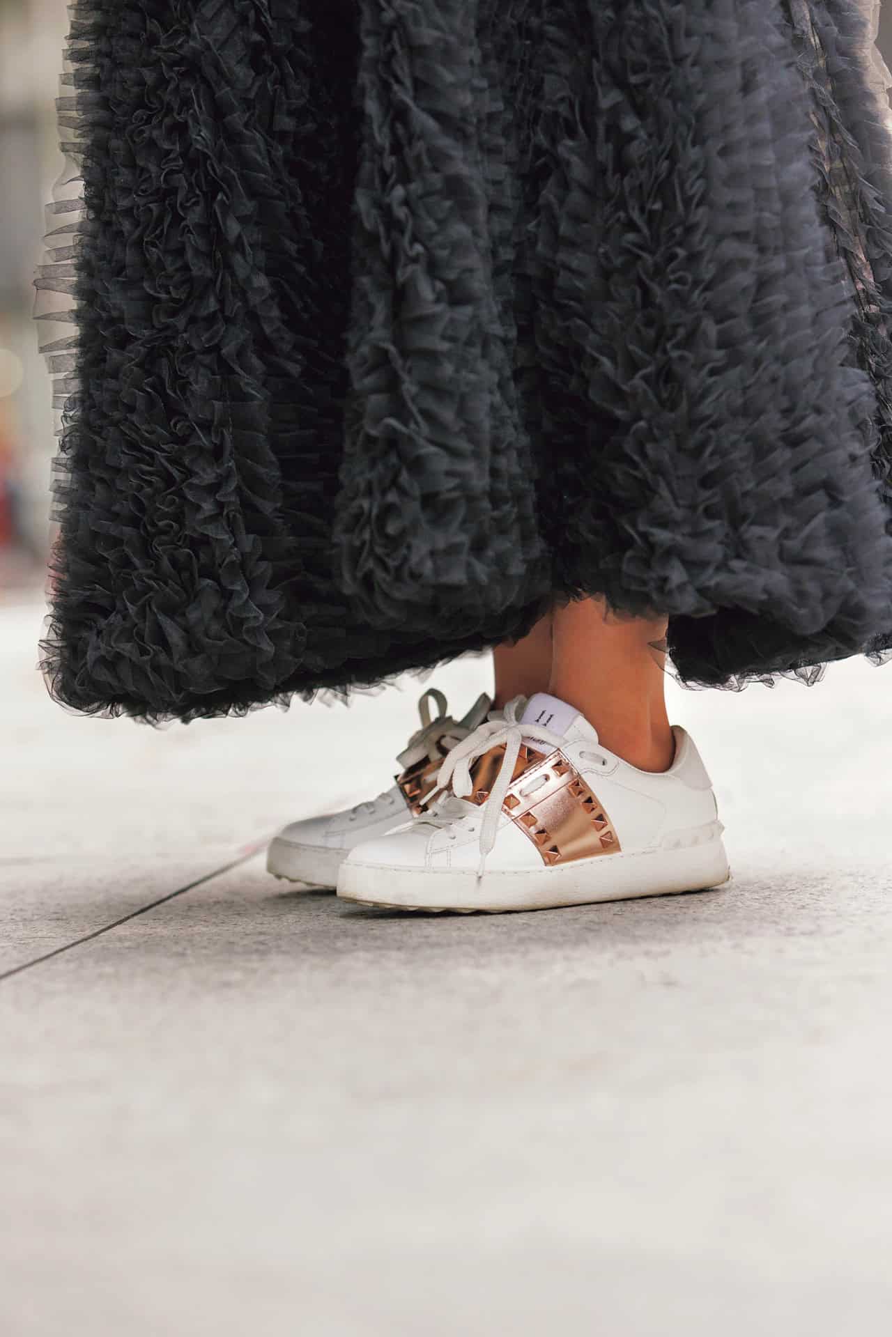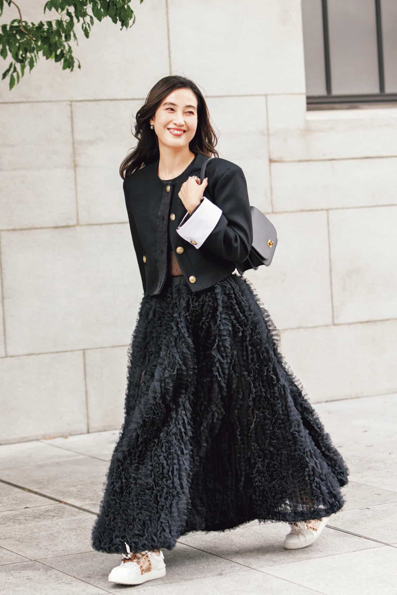 チュールスカートの甘さに、スタッズ付きスニーカーで辛口アクセントをプラス。くるぶし丈ソックスで素肌を覗かせることで、抜け感も演出。オールブラックに白スニーカーを効かせた配色で、上品さをキープしながら軽やかに仕上げた好バランスコーデです。
