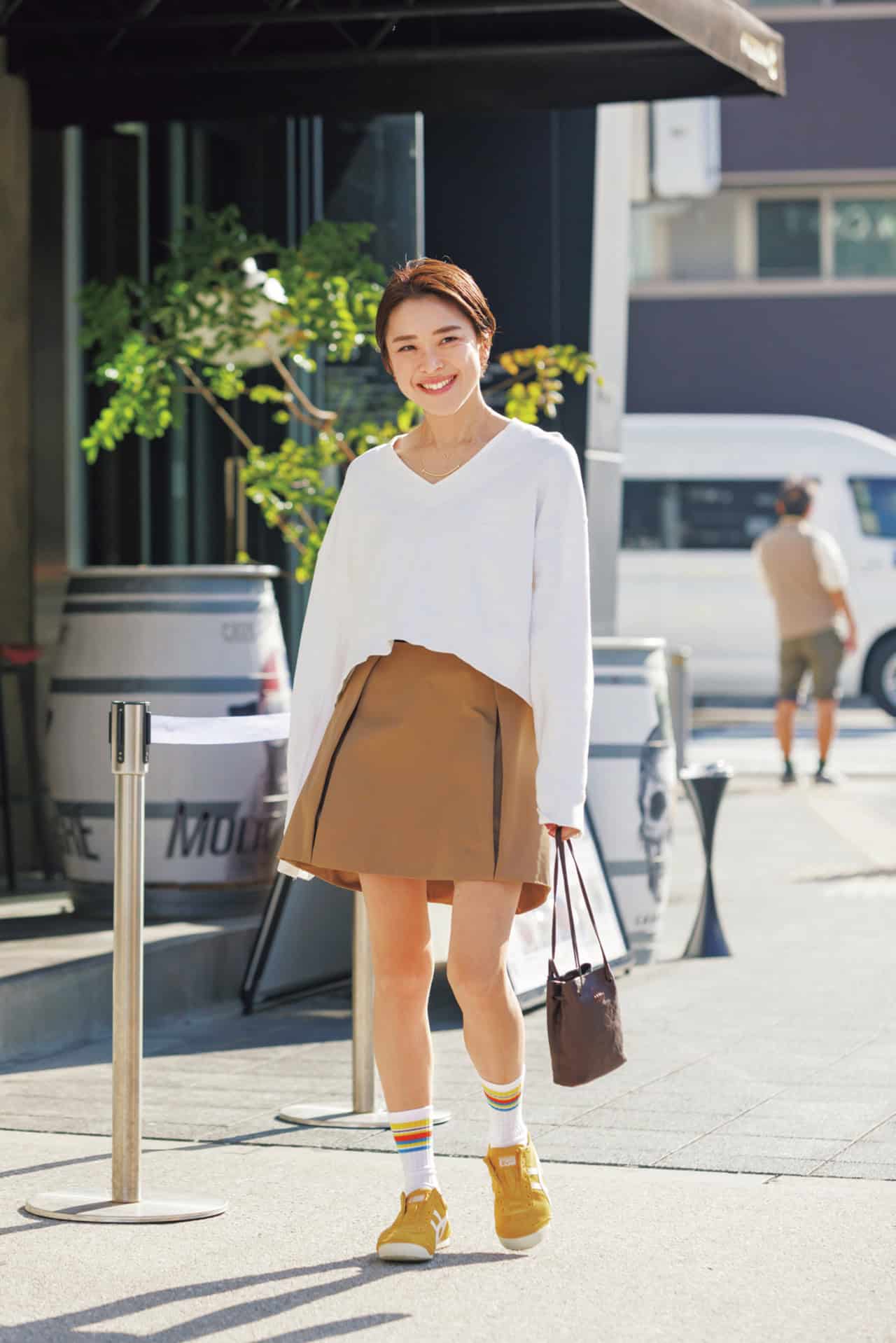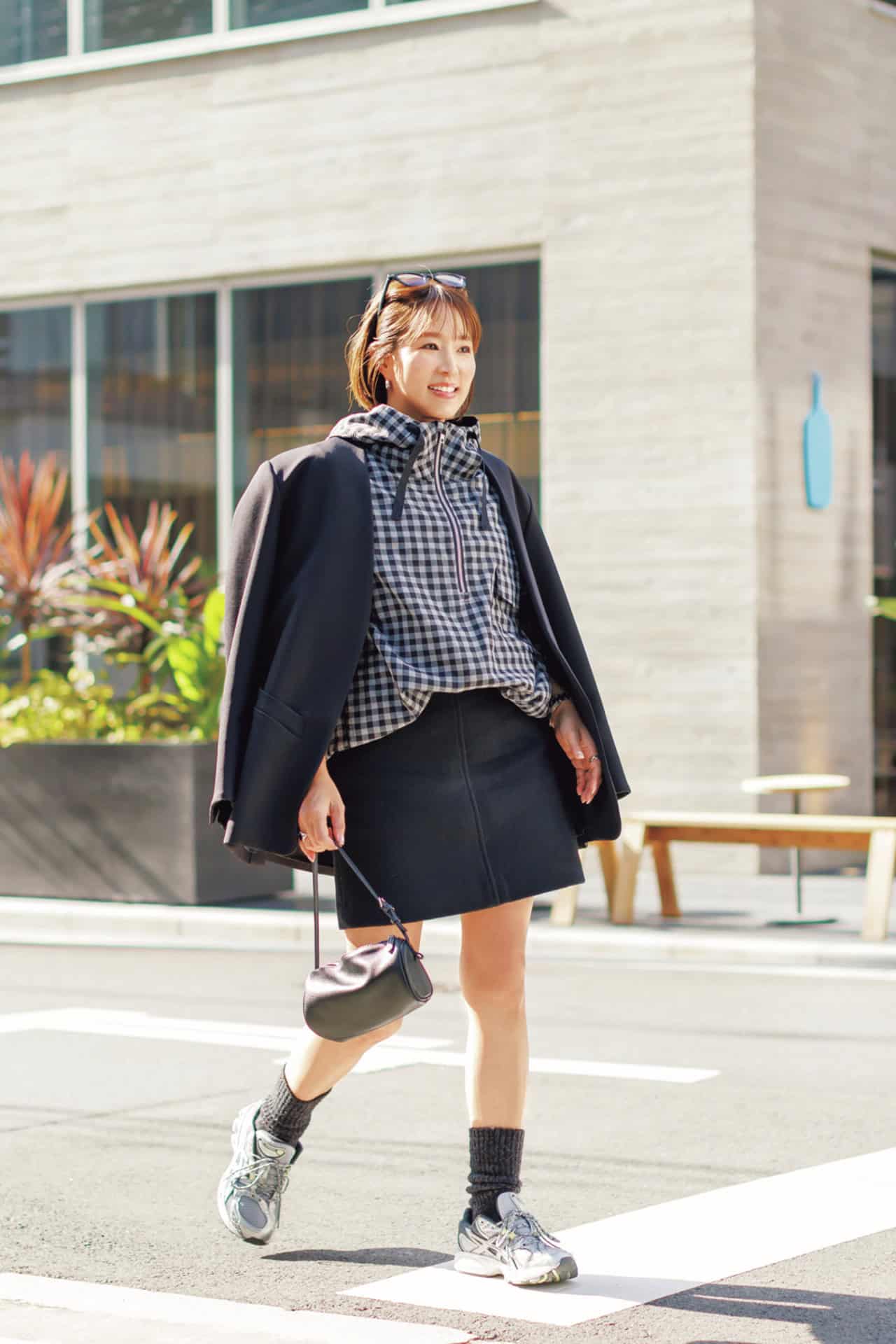 ミニスカートにアノラックパーカを合わせたスポーツMIXスタイル。そこにルーズソックス×ボリュームスニーカーで脚を華奢に見せつつ、トレンド感もキープ。ハイテクスニーカーの立体感がコーデにメリハリを生み、軽やかな春らしさを引き立てます。