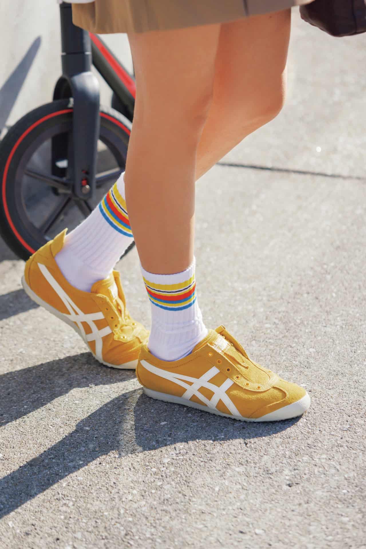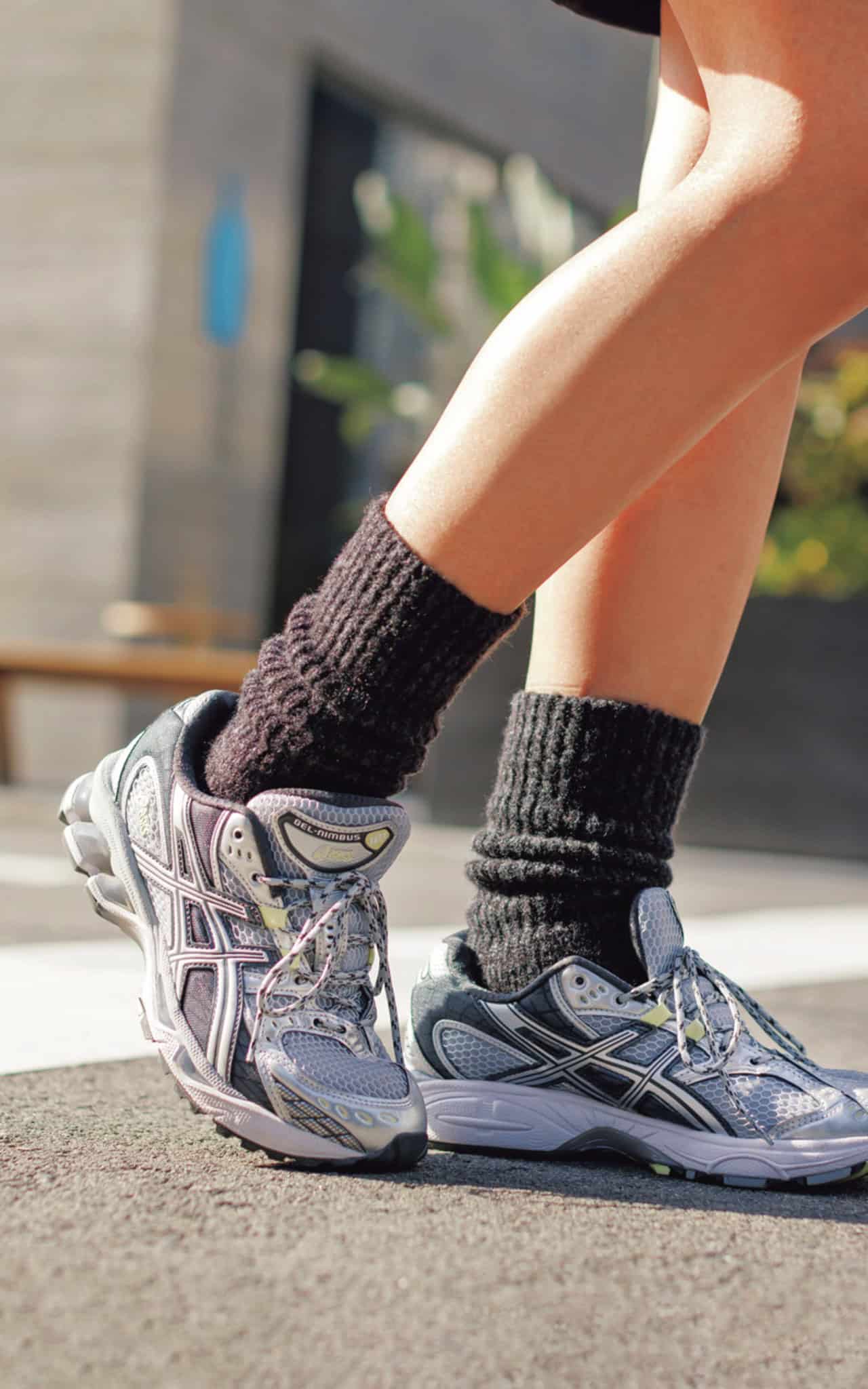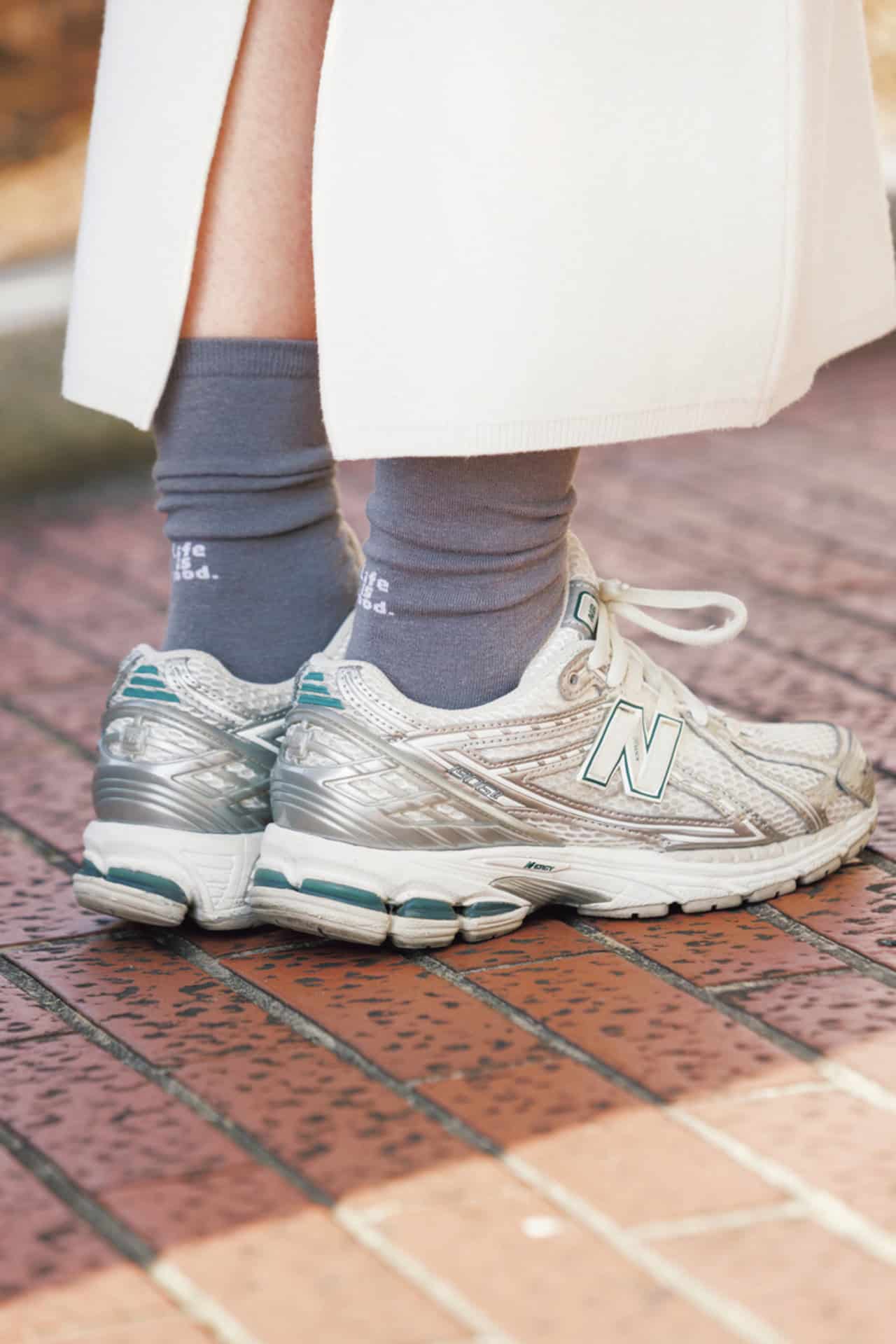 のっぺりしがちなホワイトコーデには、グレーソックスでさりげない奥行きを。シルバーのニューバランスは、ほんのり効いた差し色で都会的なテック感をプラス。足元に立体感が生まれ、シンプルながらも一気に洗練された印象が叶います。