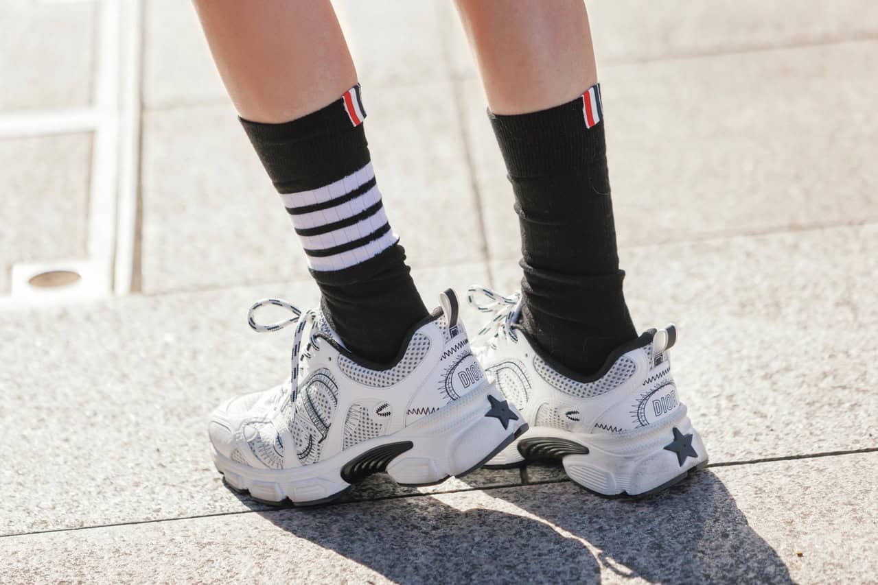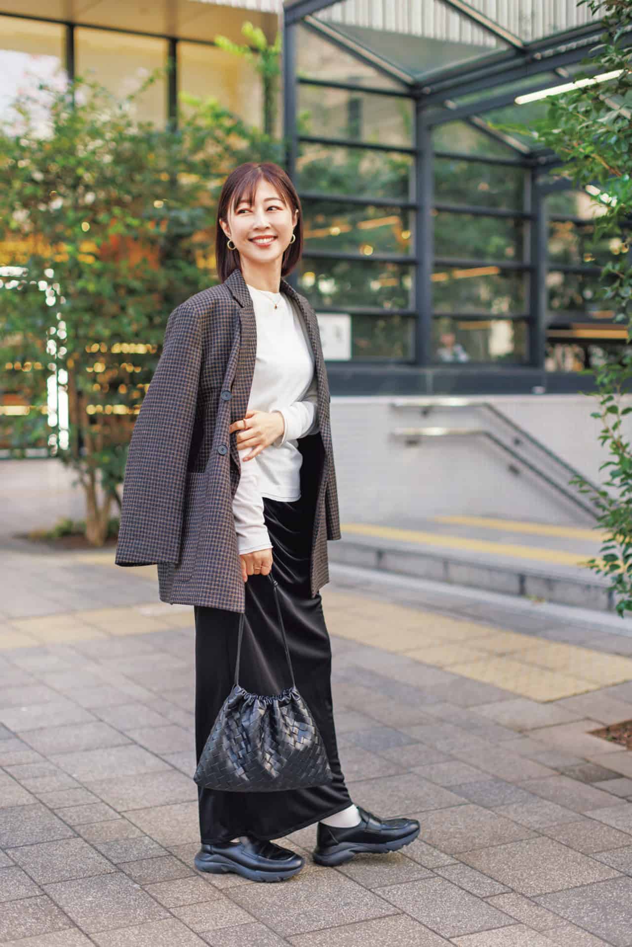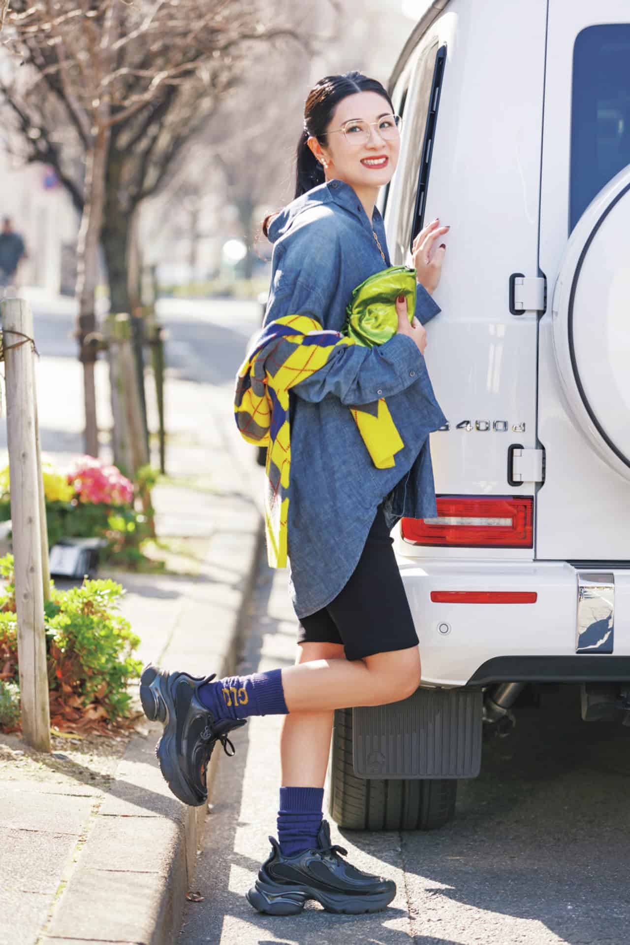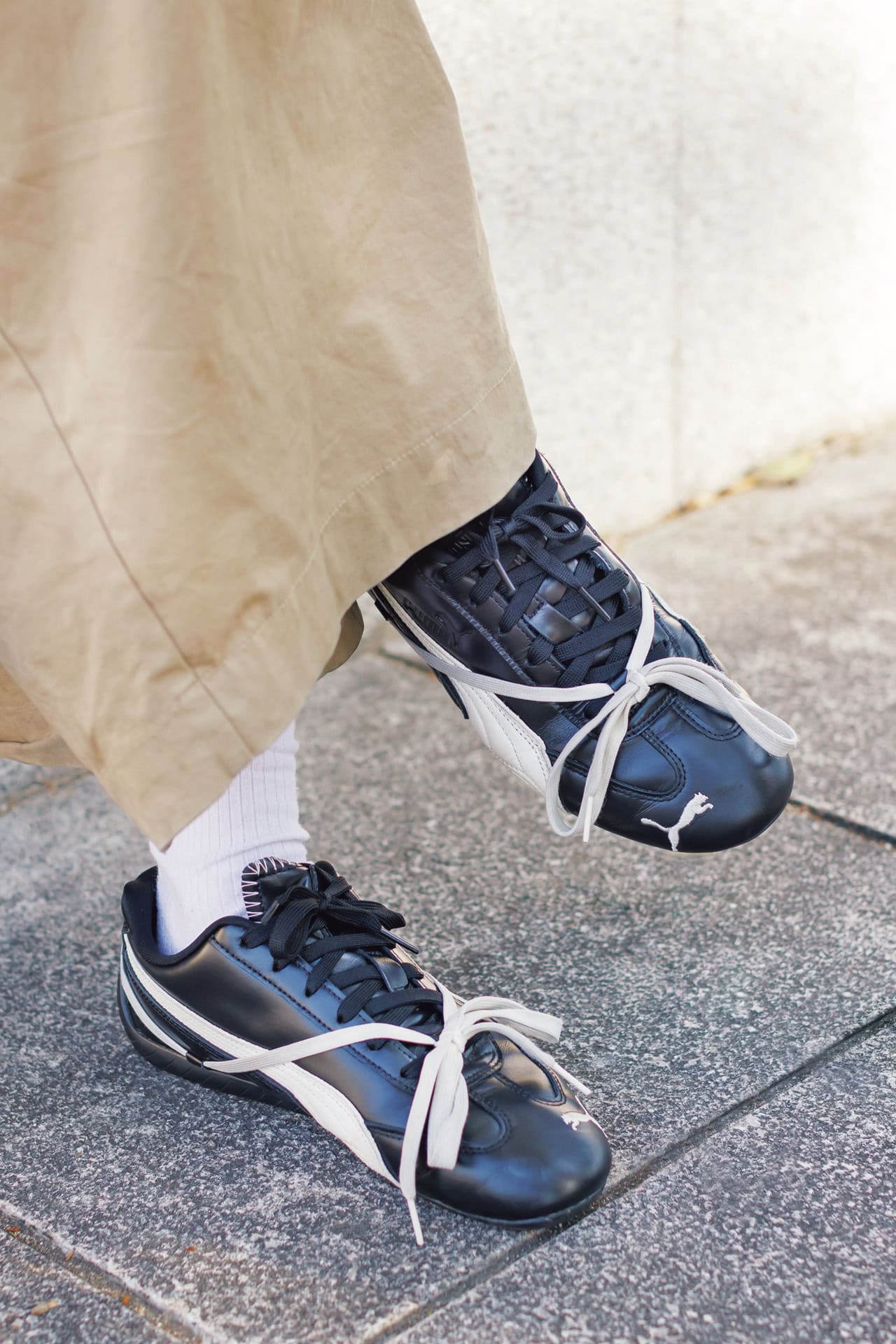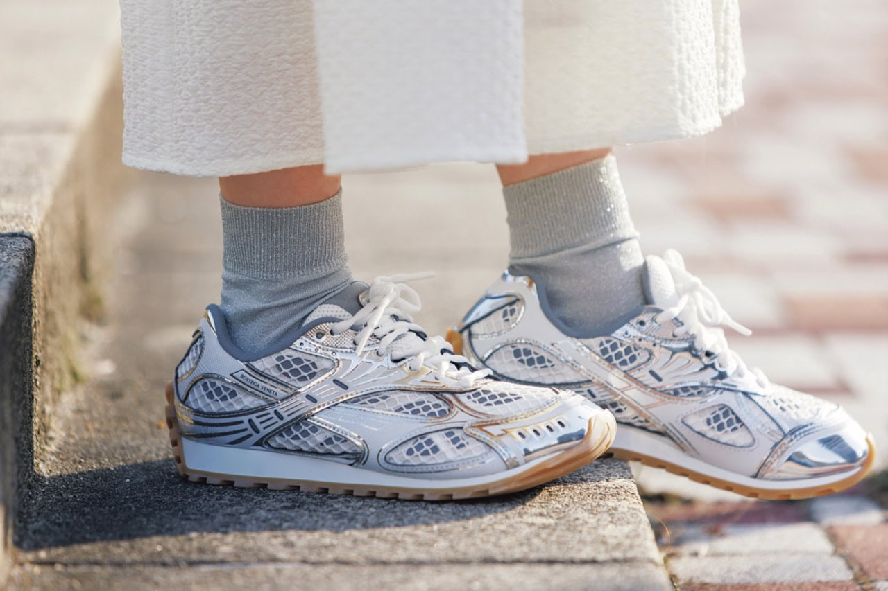 存在感のあるボリュームスニーカーは、コンパクトなソックスで足元をすっきり見せるのがコツ。モノトーンでまとめることで、ハイブランドならではの品格を引き立てつつ、日常に馴染むバランスに。ジャケットやバッグもボリューム感を揃えて、全体に立体感のある洗練コーデが完成します。