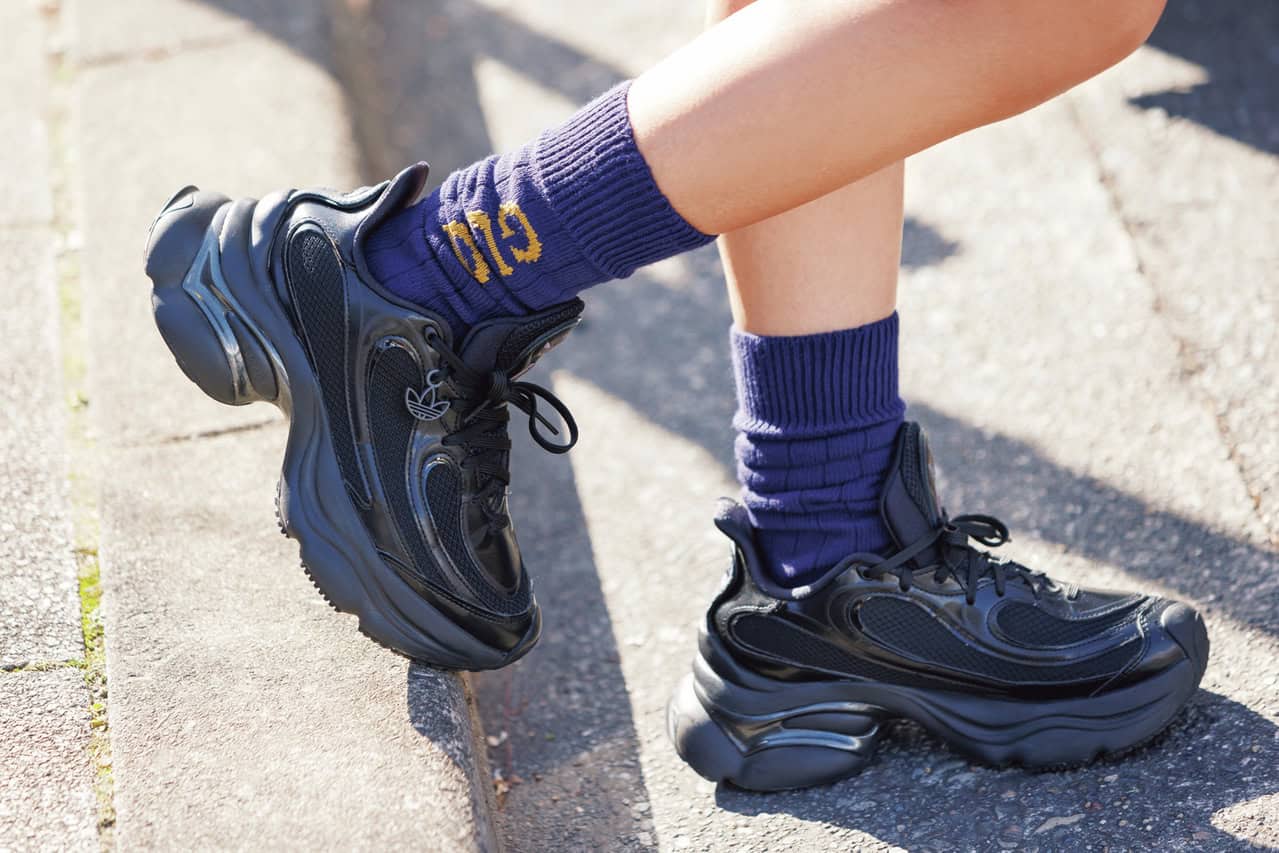難易度の高いバイカーパンツは、重厚感のあるスニーカーで今どきバランスにシフト。オールブラックでまとめた足元がコーデを引き締めつつ、自然とスタイルアップが叶います。ニュアンスのあるソックス使いで抜け感を添え、大人でも取り入れやすいスポーティスタイルに昇華します。