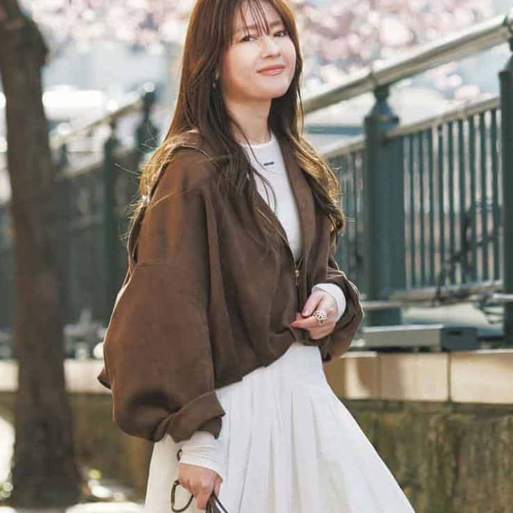 動きやすさが欲しい春は、ロングスカート×スニーカーが頼れる組み合わせ。ブラウンで色味を統一することで、カジュアルと女らしさのバランスが絶妙に。足元のスニーカーも同トーンで揃えると、こなれ感と統一感を両立した洗練コーデが完成します。