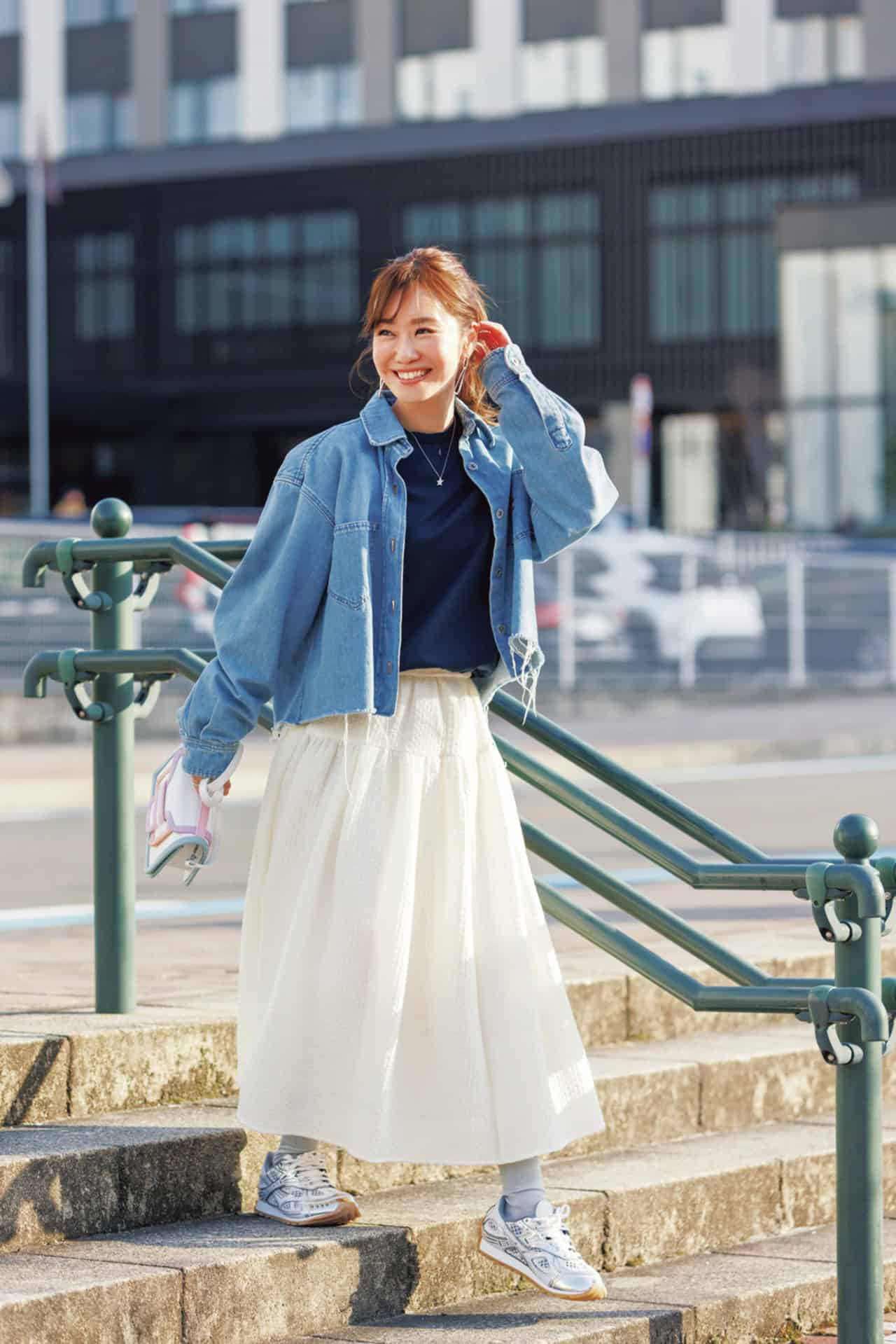 シルバースニーカーは、春コーデに絶妙なこなれ感をプラス。デニムシャツ×白スカートのシンプルスタイルに、ハイテクスニーカーで洗練された印象をオン。軽やかさを保ちながら、足元でしっかり差がつく着こなしに仕上がります。