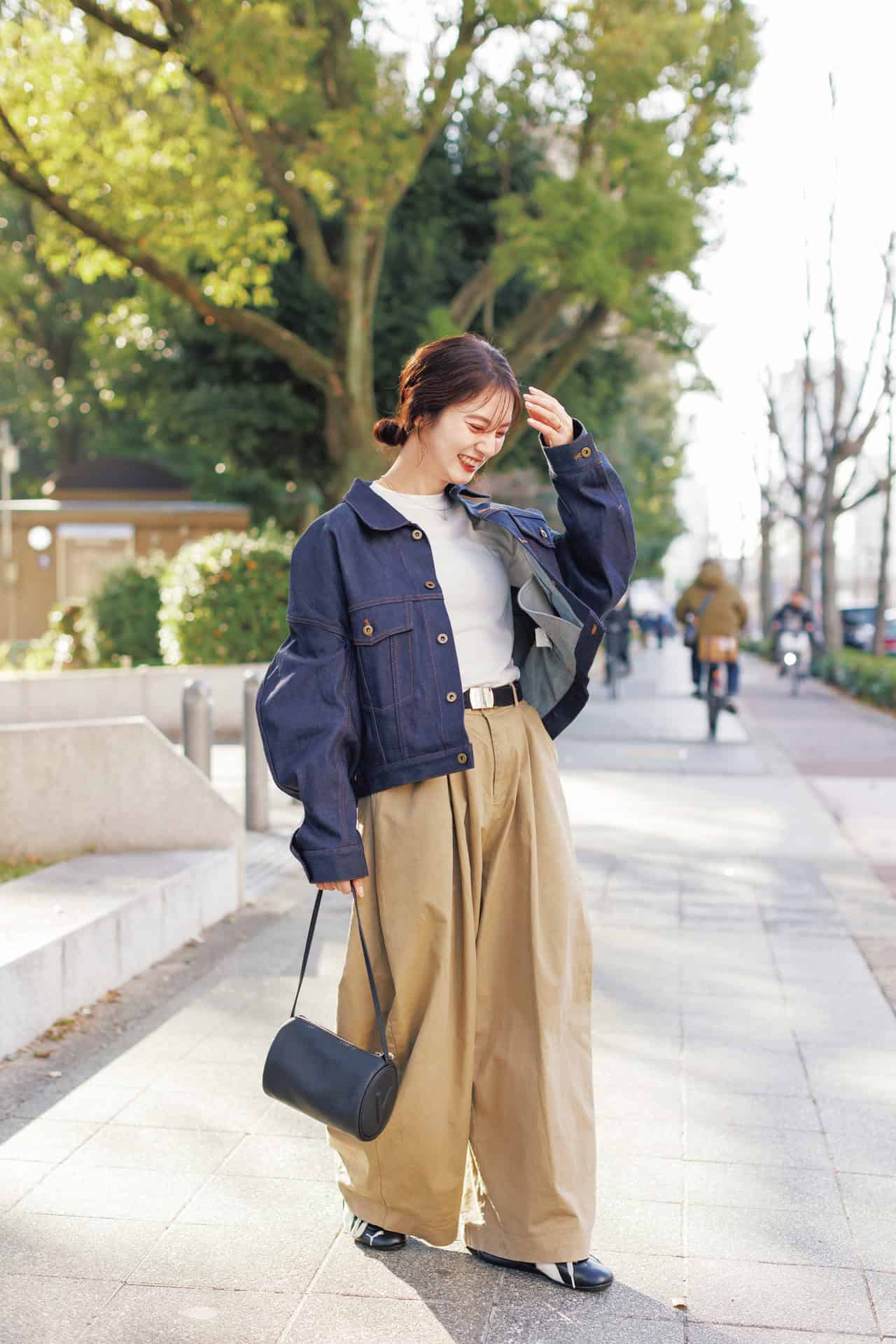 黒×白のバイカラースニーカーは、コーデを選ばず活躍する万能アイテム。白のリボン風シューレースがほんのり甘さを添え、デニムジャケット×ワイドパンツのカジュアルに女性らしさをプラス。足元に効かせるだけで、ぐっとこなれた印象に仕上がります。