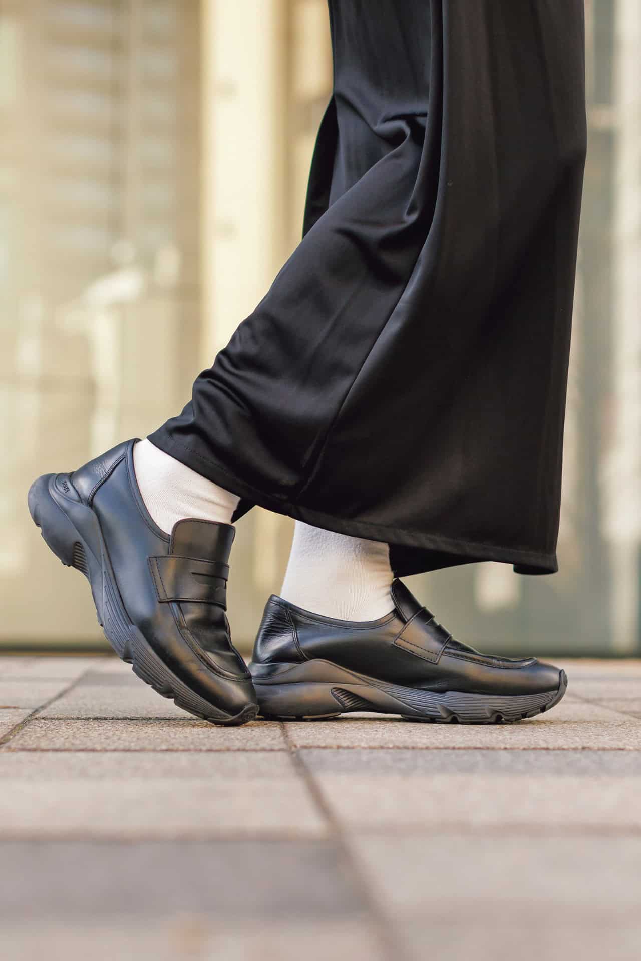 ローファー感覚で履けるスニーカーは、トラッドスタイルの新定番。サテンスカート×ジャケットのきれいめコーデに、程よいカジュアルさと快適さをプラス。異素材のコントラストが、シンプルな装いに奥行きと洒落感をもたらします。