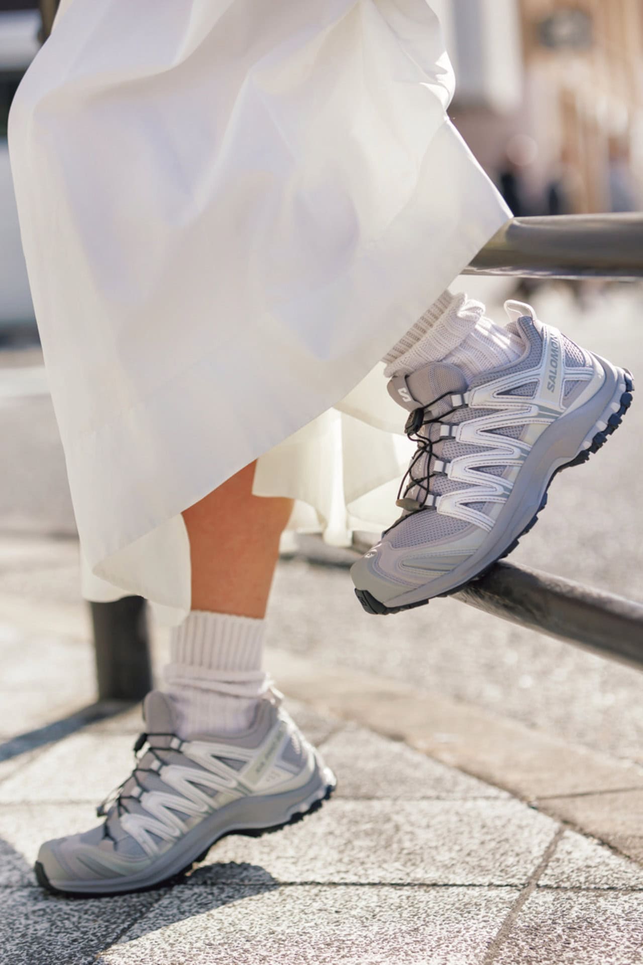 ハイテクなサロモンを投入することで、甘めのふんわりスカートも一気に大人バランスに。ロゴスウェット×白スカートの柔らか配色は、同系色スニーカーで統一感を。くしゅっとたるませたソックスで抜け感を足すのがポイント。軽快さとモード感を両立した、都会派春コーデです。