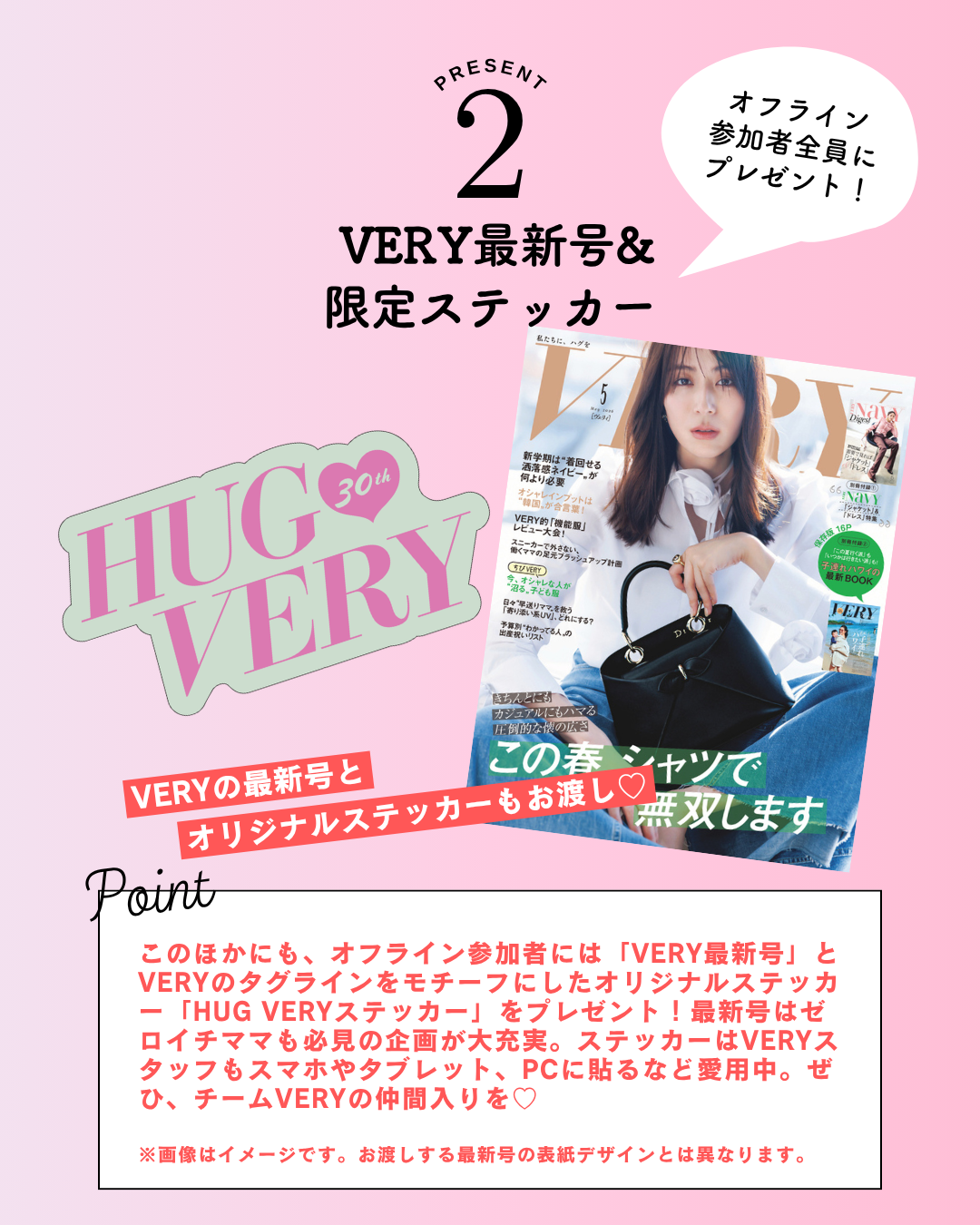 参加者全員におみやげとして「MammaBabyクールミスト」、「VERY最新号1冊」、「VERYステッカー」をお渡し!その他抽選で豪華プレゼントもご用意しております。ぜひこの機会をお見逃しなく。