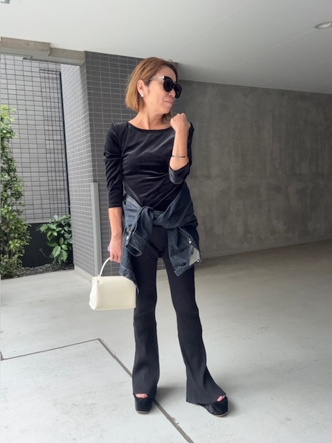 というわけで、よく会う人には、きっと内心“またこれ着てる”と思われるくらいどちらもヘビロテしております。特にベロアトップスは、母の顔をしたい時のジャケットのインナーとして、品の良さを発揮してくれるのも頼りになる点。ピタッとフォルムや肌見せのおかげで、背中ケアや食べすぎ飲みすぎ注意報など、自分メンテナンスの意識もアップしました」